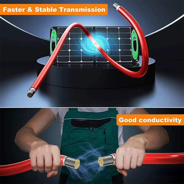 ລວດທອງແດງ Tinned: ສາຍໄຟແສງຕາເວັນແມ່ນເຮັດຈາກວັດສະດຸທອງແດງທີ່ເຮັດດ້ວຍກົ່ວ, 84 strands 0.295 mm tinned copper wire is in each 10 guge wire, have better conductivity, thermal conductivity, and corrosion resistance than other common material, extra-thick insulation ສາມາດທົນຄວາມຮ້ອນແລະເຢັນ -40 ℃ -90 ℃. ຖືກອອກແບບມາສໍາລັບສະພາບອາກາດທີ່ຮຸນແຮງ, ມັນສາມາດຖືກຝັງຢູ່ໃນດິນໂດຍກົງ.