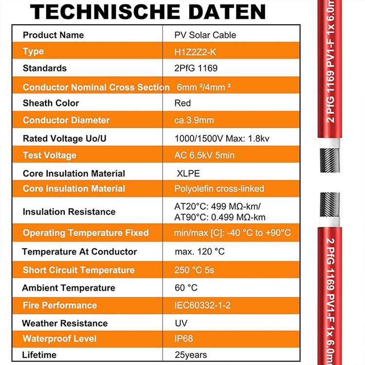 ສາຍໄຟແສງຕາເວັນ Photovoltaic ມືອາຊີບ: ສາຍຂະຫຍາຍແຜງແສງອາທິດນີ້ຕອບສະຫນອງມາດຕະຖານ TUV ສໍາລັບຄໍາຮ້ອງສະຫມັກແສງຕາເວັນ photovoltaic ແລະສາມາດນໍາໃຊ້ໃນສະພາບແວດລ້ອມທີ່ຫຼາກຫຼາຍເພື່ອຮັບປະກັນຄວາມປອດໄພຂອງວົງຈອນ. ພື້ນທີ່ຕັດ: 6mm2, ລະດັບອຸນຫະພູມ: ສະພາບແວດລ້ອມ -40 ° C-90 ° C, ແຮງດັນການທົດສອບ: 6500V, ແຮງດັນໄຟຟ້າຈັດອັນດັບ: DC1500V, ຄວາມຕ້ານທານ conductor: (20 ° C) ≤≤5.09Ω / KM, ການຕໍ່ຕ້ານສະພາບອາກາດ: UV, ອັດຕາປະຈຸບັນ: 57A.